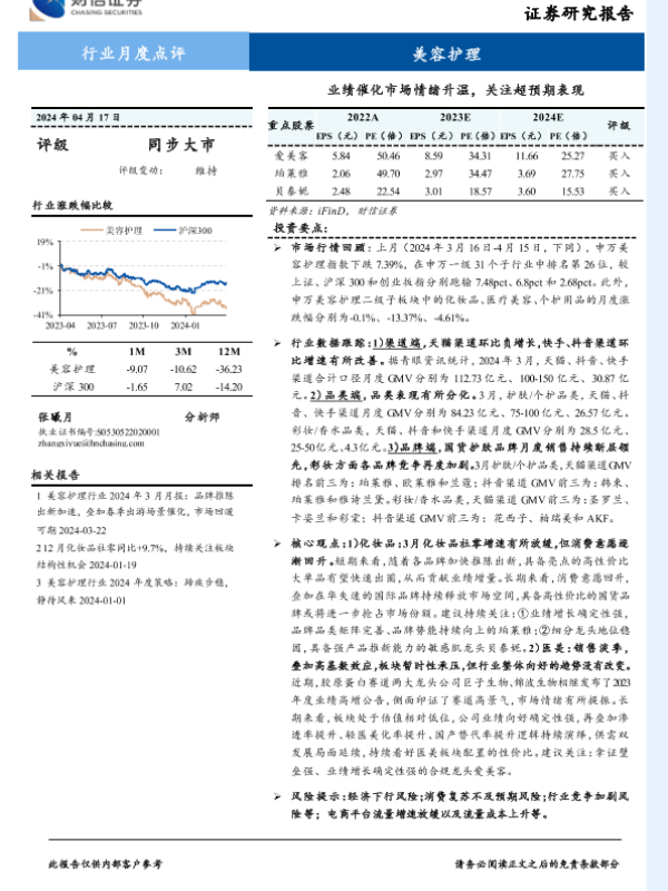 【财信证券】【20240417】美容护理行业月度点评:业绩催化市场情绪升温,关注超预期表现-12页