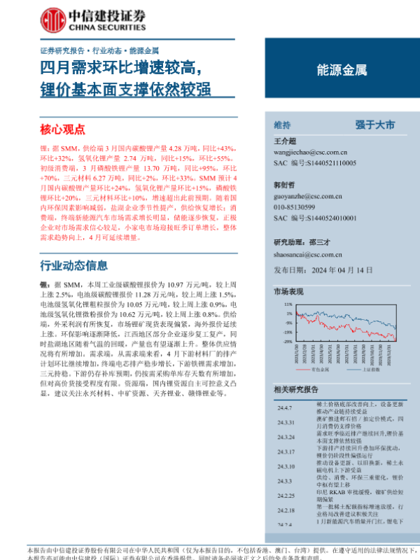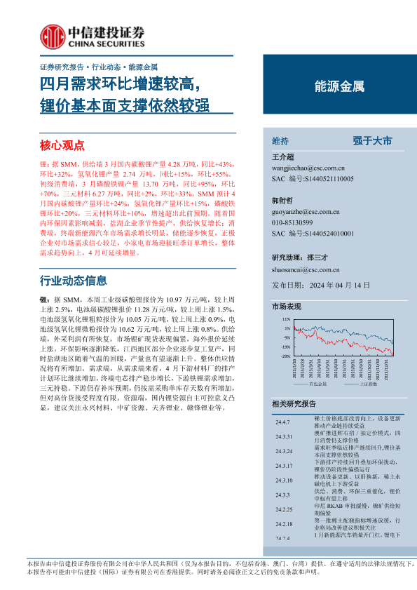 【中信建投证券】【20240414】能源金属行业:四月需求环比增速较高,锂价基本面支撑依然较强-12页