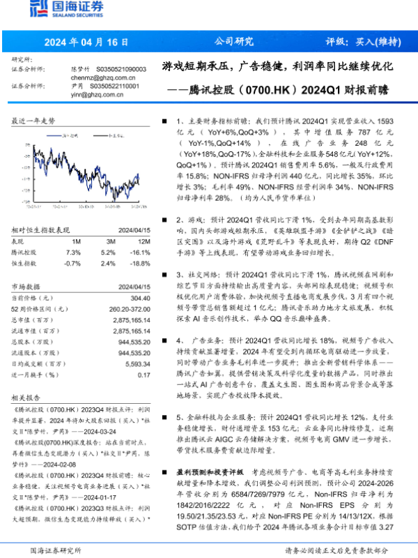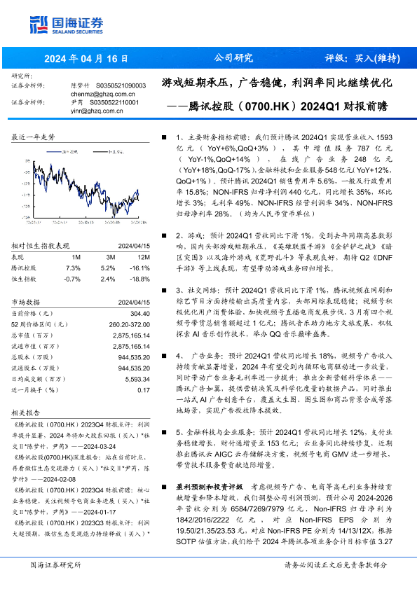 【国海证券】【20240416】腾讯控股(0700.HK)2024Q1财报前瞻:游戏短期承压,广告稳健,利润率同比继续优化-10页