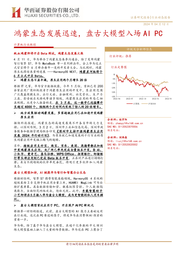 【华西证券】【20240412】计算机行业跟踪:鸿蒙生态发展迅速,盘古大模型入场AI+PC-11页