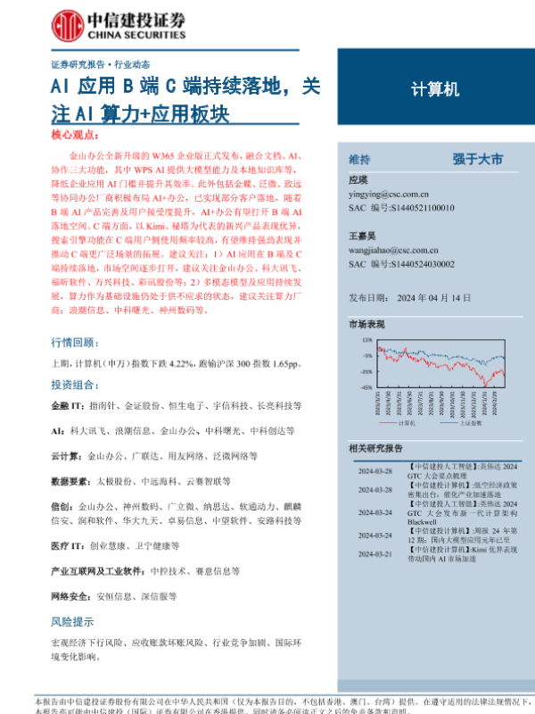 【中信建投证券】【20240414】计算机行业:AI应用B端C端持续落地,关注AI算力+应用板块-11页