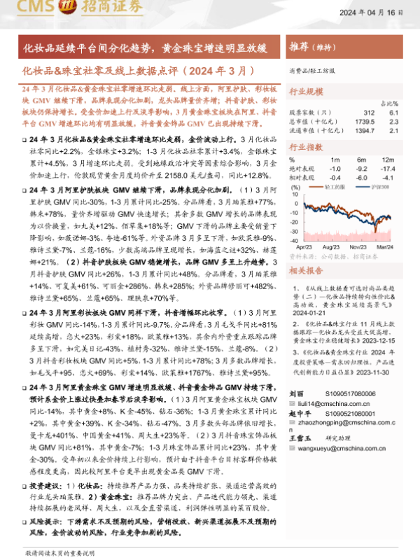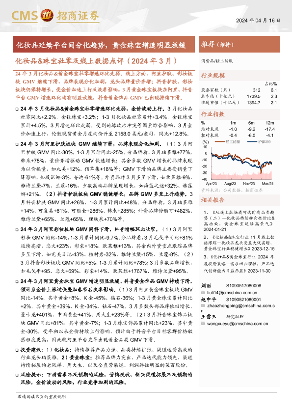 【海通证券】【20240416】轻工纺服行业化妆品&珠宝社零及线上数据点评(2024年3月)-24页