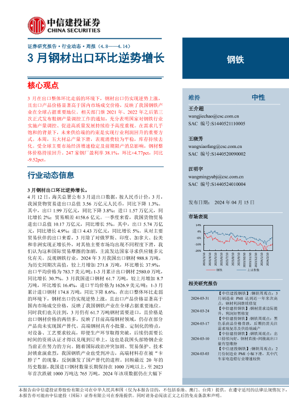 【中信建投证券】【20240415】钢铁行业:3月钢材出口环比逆势增长-26页