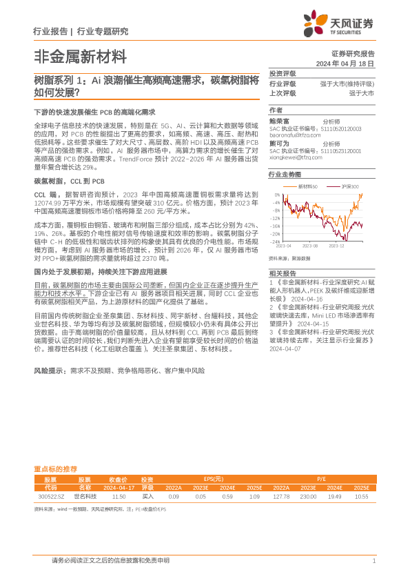 【天风证券】【20240418】非金属新材料行业树脂系列1:Ai浪潮催生高频高速需求,碳氢树脂将如何发展?-13页