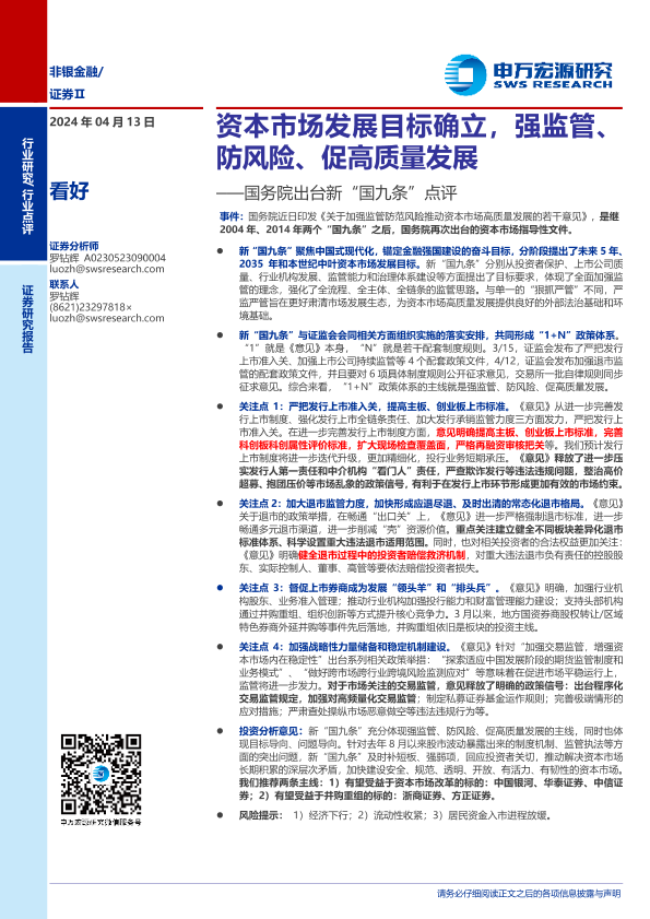 【申万宏源】【20240413】非银金融行业国务院出台新“国九条”点评:资本市场发展目标确立,强监管、防风险、促高质量发展-11页