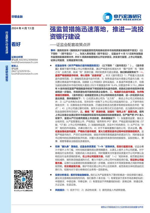 【申万宏源】【20240413】非银金融行业证监会配套政策点评:强监管措施迅速落地,推进一流投资银行建设-14页