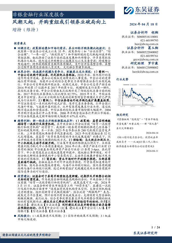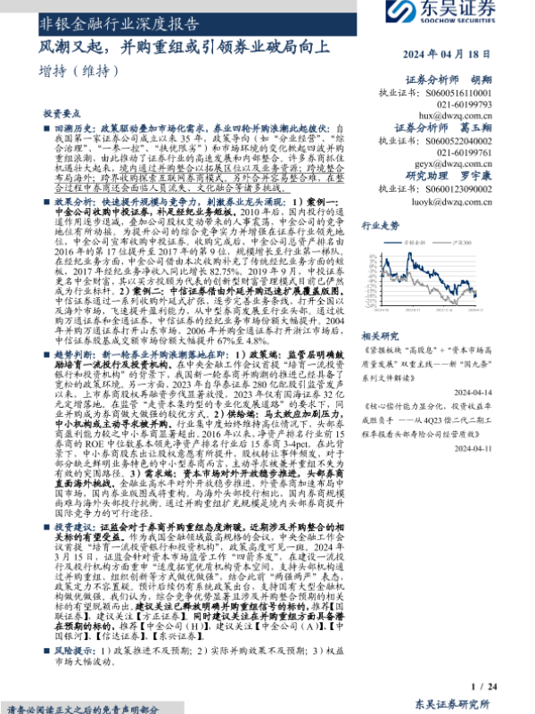 【东吴证券】【20240418】非银金融行业深度报告:风潮又起,并购重组或引领券业破局向上-24页