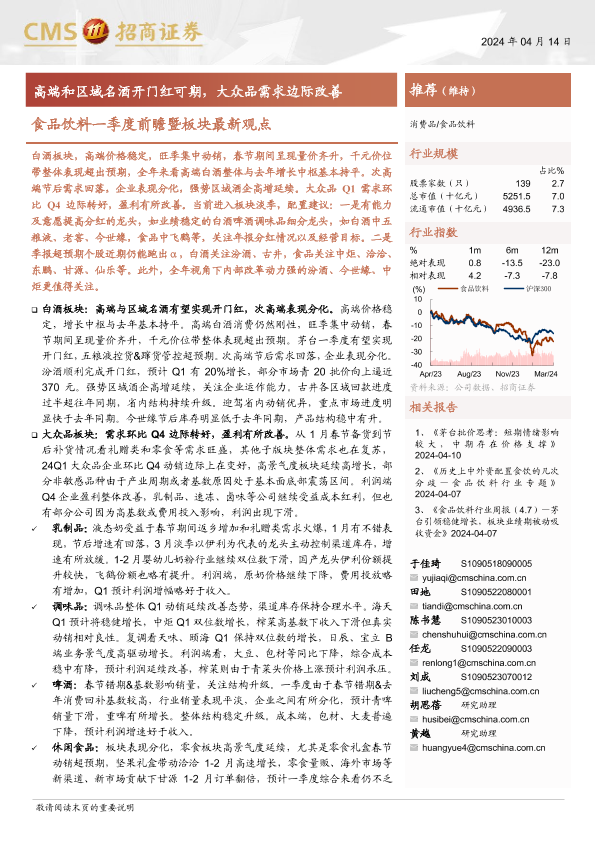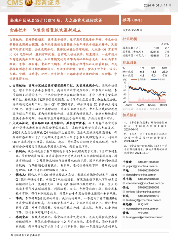 【海通证券】【20240414】食品饮料行业一季度前瞻暨板块最新观点:高端和区域名酒开门红可期,大众品需求边际改善-14页