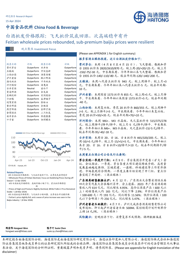 【海通国际】【20240415】食品饮料行业白酒批发价格跟踪:飞天批价筑底回涨,次高端稳中有升-10页