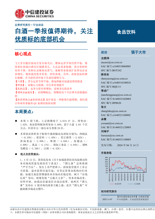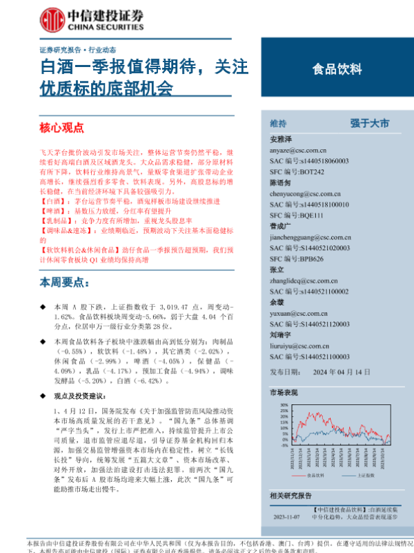 【中信建投证券】【20240414】食品饮料行业:白酒一季报值得期待,关注优质标的底部机会-24页