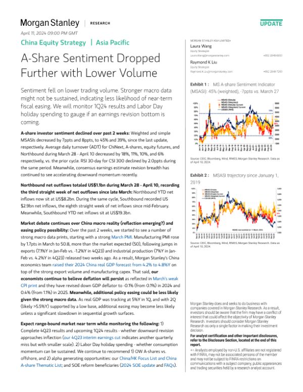 【Morgan Stanley】【20240410】Morgan Stanley-China Equity Strategy A-Share Sentiment Dropped Further with Lower Volume-10页