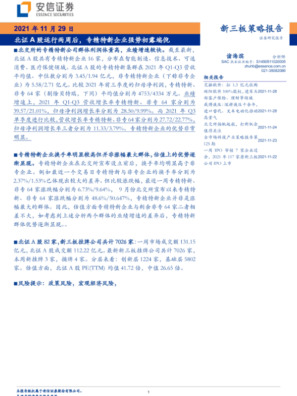 【安信证券】【20211129】新三板策略报告:北证A股运行两周后,专精特新企业强势初露端倪-19页