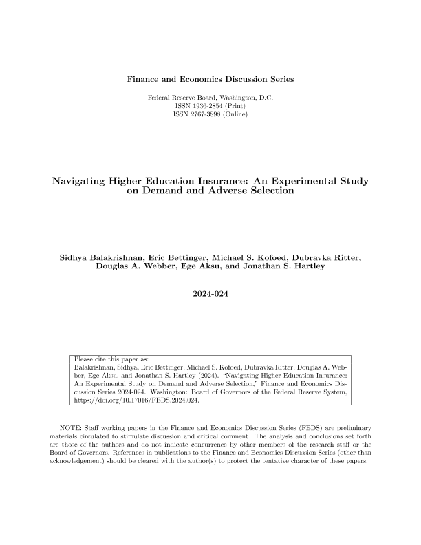 【Federal Reserve Board】【20240221】Navigating Higher Education Insurance An Experimental Study on Demand and Adverse Selection-57页