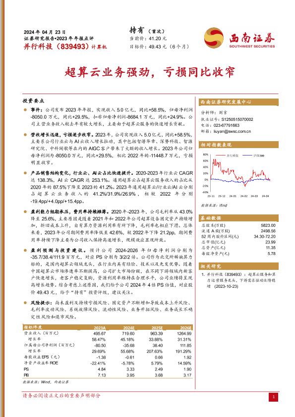 【西南证券】【20240423】2023年年报点评:超算云业务强劲,亏损同比收窄-11页