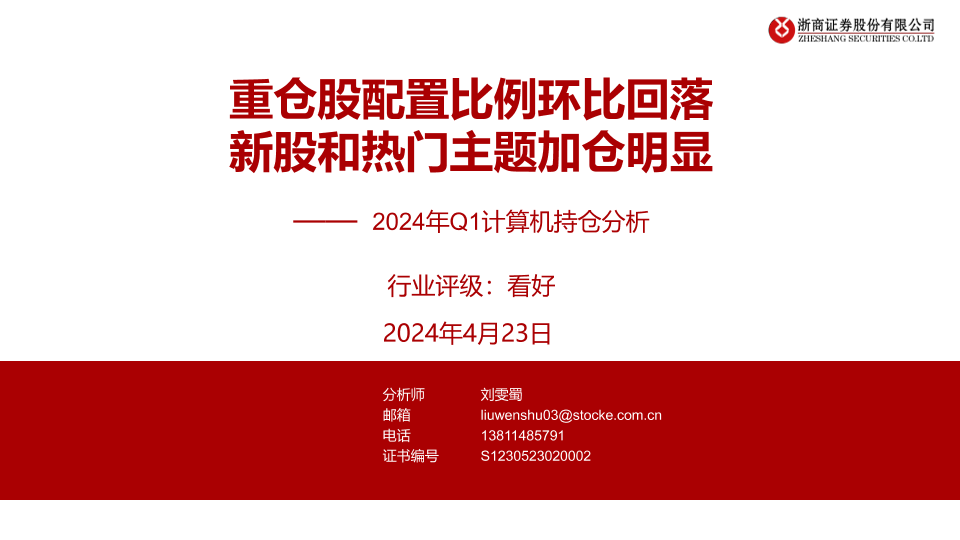 【浙商证券】【20240423】2024年Q1计算机行业持仓分析:重仓股配置比例环比回落,新股和热门主题加仓明显-11页
