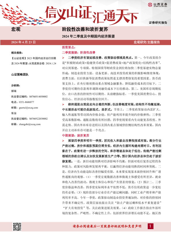 【山西证券】【20240423】2024年二季度及中期国内经济展望:阶段性改善和波折复苏-32页