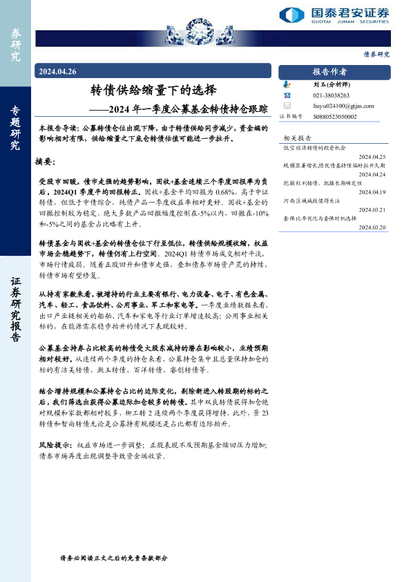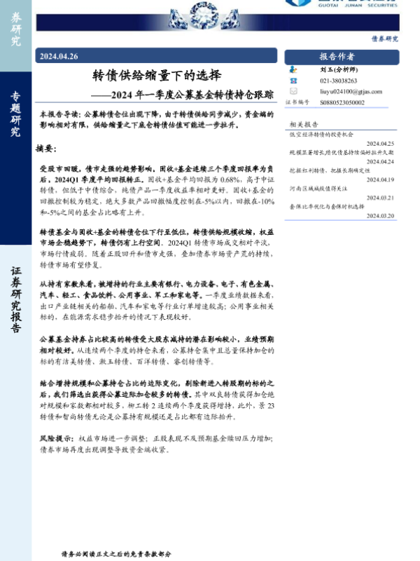 【国泰君安证券】【20240426】2024年一季度公募基金转债持仓跟踪:转债供给缩量下的选择-12页