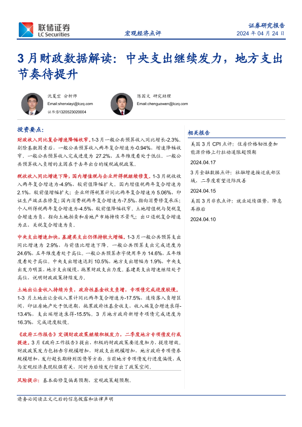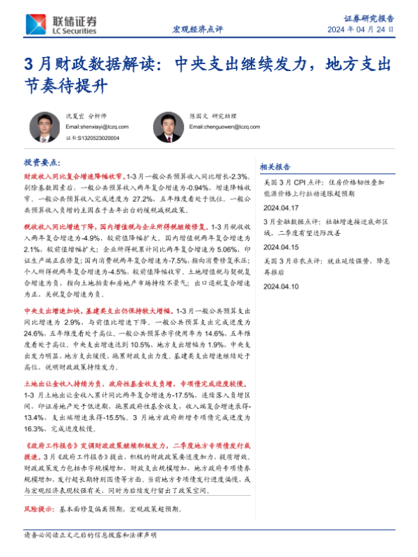 【联储证券】【20240424】3月财政数据解读:中央支出继续发力,地方支出节奏待提升-13页