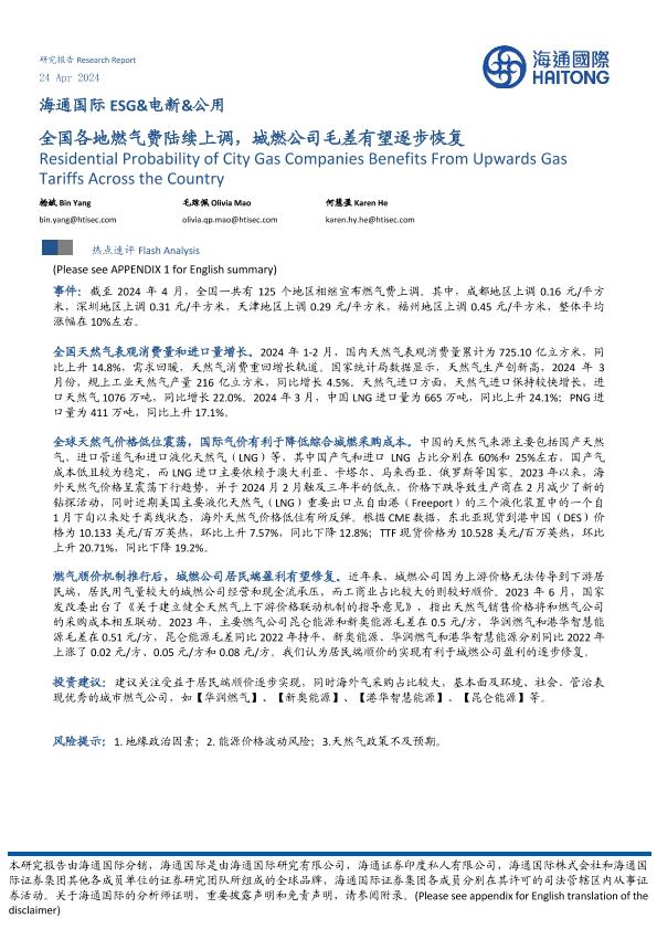 【海通国际】【20240424】ESG&电新&公用行业:全国各地燃气费陆续上调,城燃公司毛差有望逐步恢复-10页