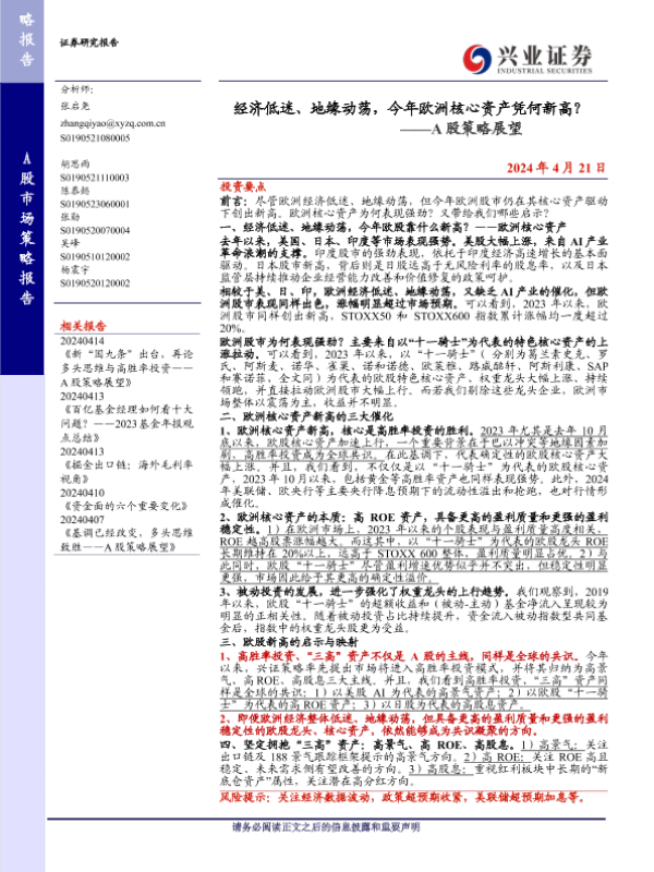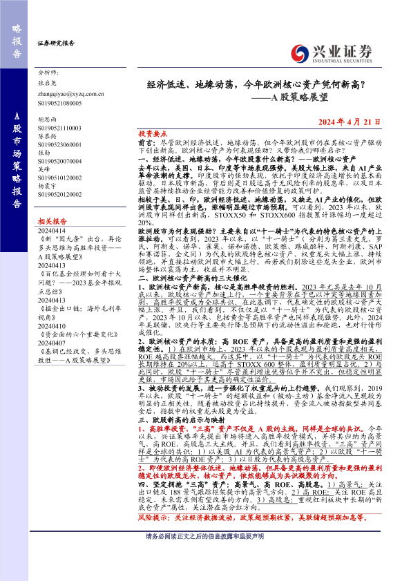 【兴业证券】【20240421】经济低迷、地缘动荡,今年欧洲核心资产凭何新高?——A股策略展望-16页