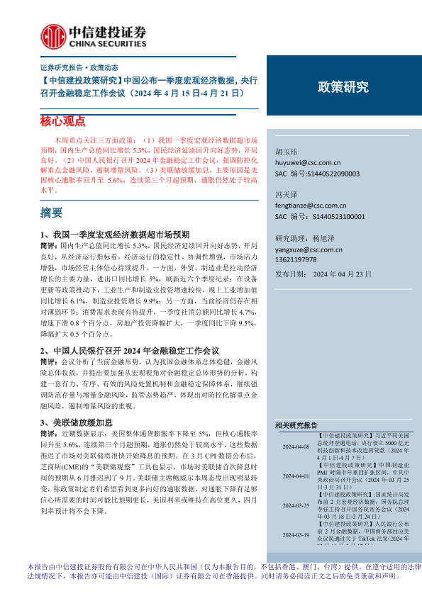 【中信建投证券】【20240423】中国公布一季度宏观经济数据,央行召开金融稳定工作会议-16页
