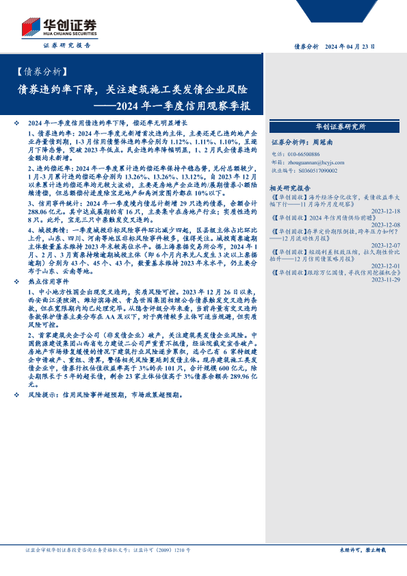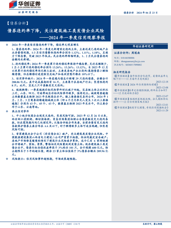 【华创证券】【20240423】【债券分析】2024年一季度信用观察季报:债券违约率下降,关注建筑施工类发债企业风险-14页