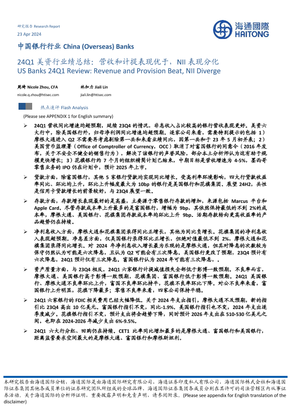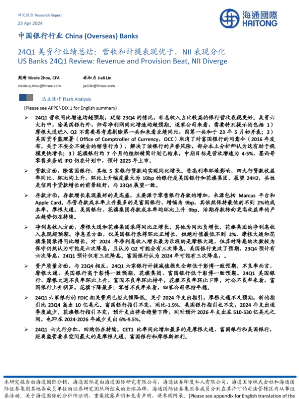 【海通国际】【20240423】24Q1美资行业绩总结:营收和计提表现优于,NII表现分化-14页