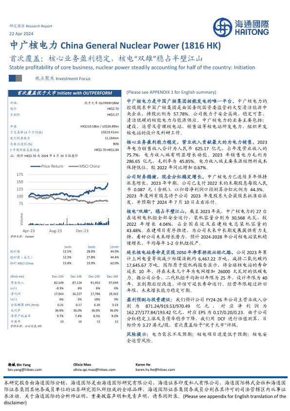 【海通国际】【20240422】中广核电力(01816.HK)首次覆盖:核心业务盈利稳定,核电“双雄”稳占半壁江山-19页