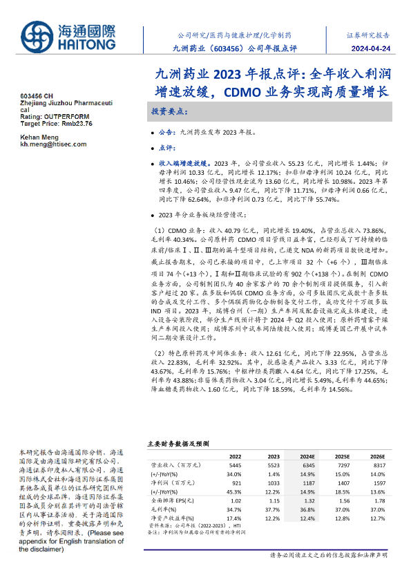 【海通国际】【20240422】九洲药业(603456)2023年报点评:全年收入利润增速放缓,CDMO业务实现高质量增长-11页