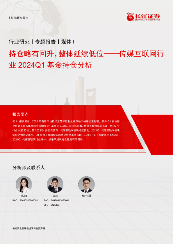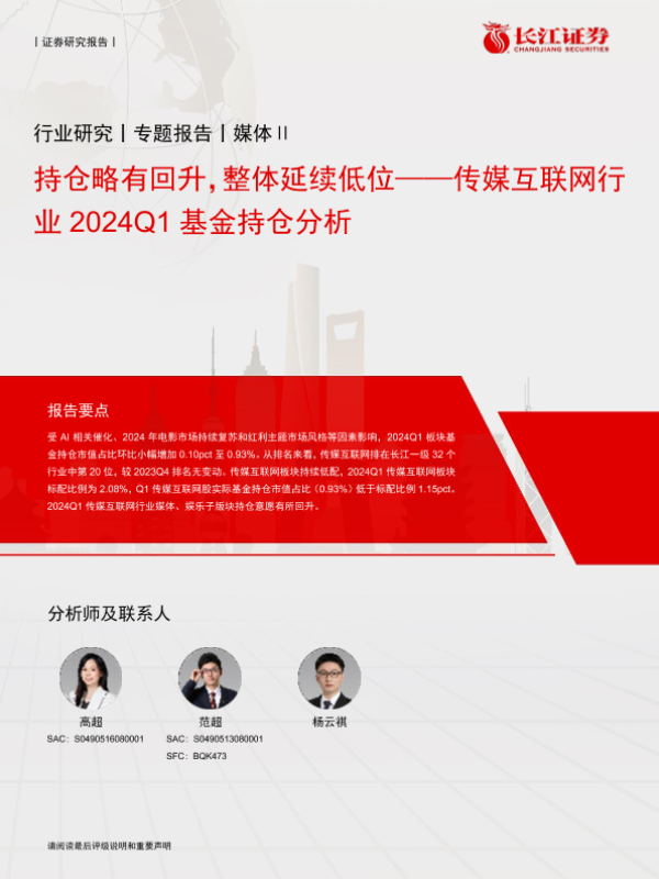 【长江证券】【20240425】传媒互联网行业2024Q1基金持仓分析:持仓略有回升,整体延续低位-11页