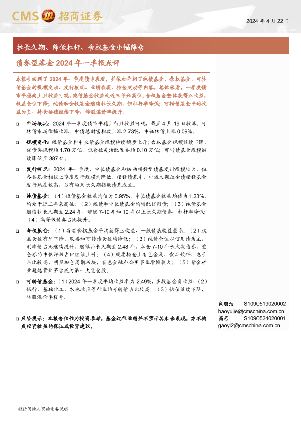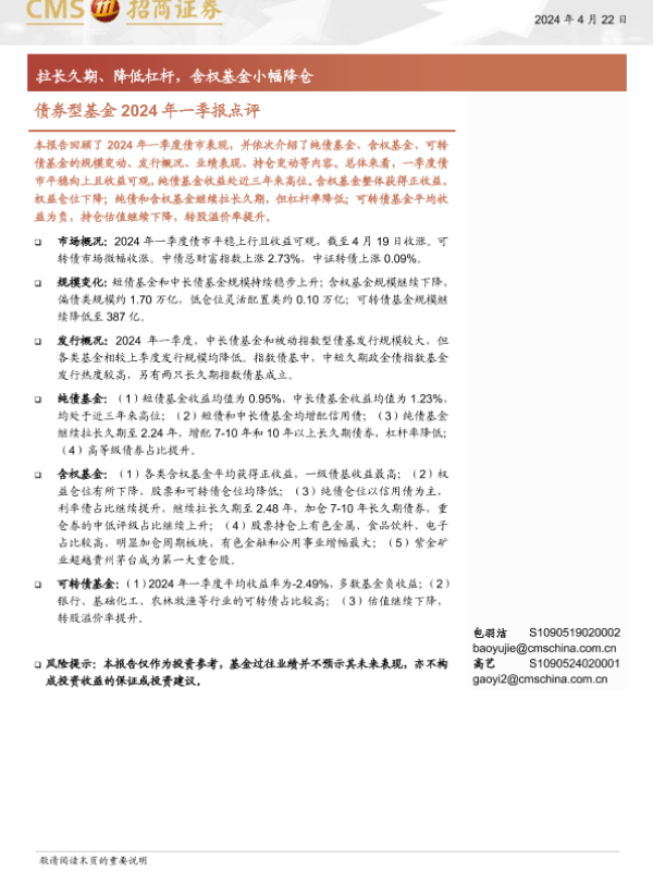 【海通证券】【20240422】债券型基金2024年一季报点评:拉长久期、降低杠杆,含权基金小幅降仓-19页