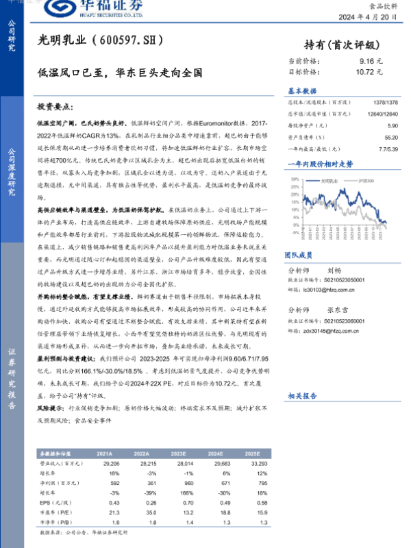 【华福证券】【20240420】光明乳业-600597.SH-低温风口已至,华东巨头走向全国-15页