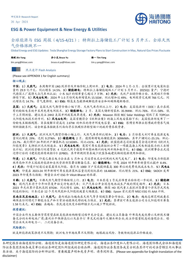 【海通国际】【20240426】全球能源与ESG行业(4/15-4/21):特斯拉上海储能工厂计划5月开工,全球天然气价格涨跌不一-42页