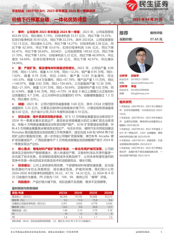 【民生证券】【20240426】华友钴业-603799.SH-2023年年报及2024年一季报点评:价格下行拖累业绩,一体化优势待显-22页
