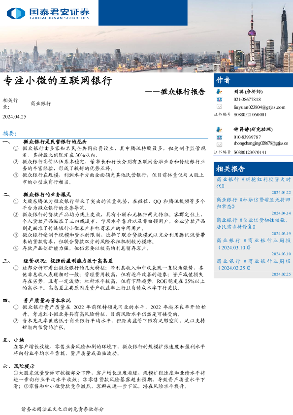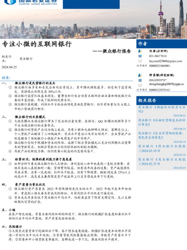 【国泰君安证券】【20240425】商业银行业微众银行报告:专注小微的互联网银行-16页