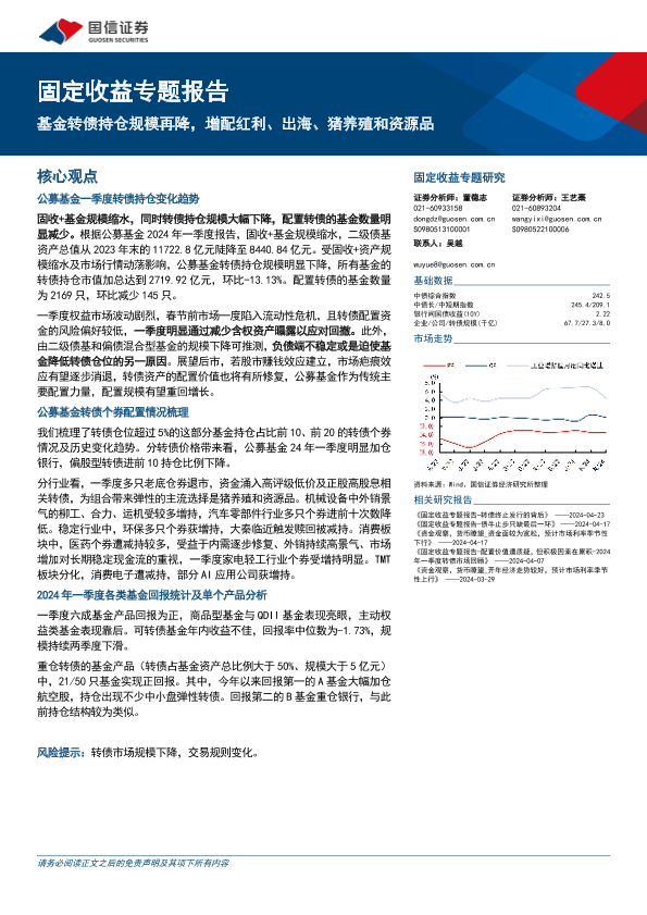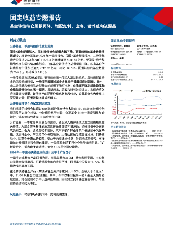 【国信证券】【20240424】固定收益专题报告:基金转债持仓规模再降,增配红利、出海、猪养殖和资源品-11页