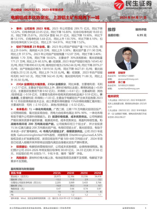 【民生证券】【20240411】天山铝业-002532.SZ-2023年年报点评:电解铝成本优势突出,上游铝土矿布局再下一城-15页