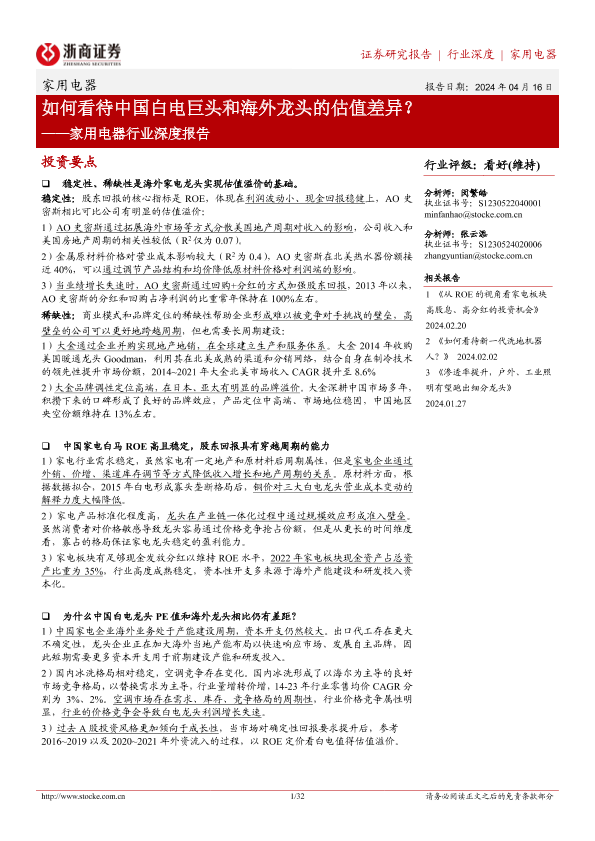 【浙商证券】【20240416】如何看待中国白电巨头和海外龙头的估值差异?-32页