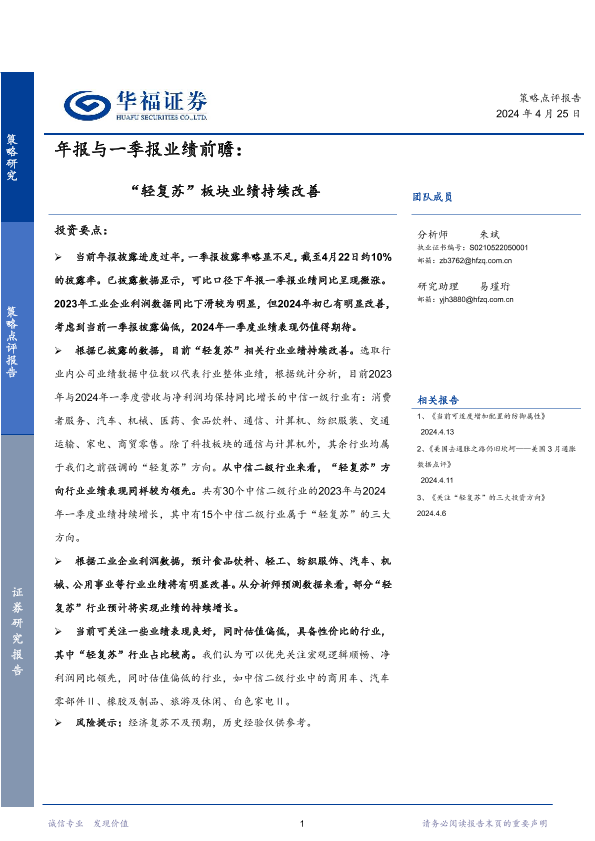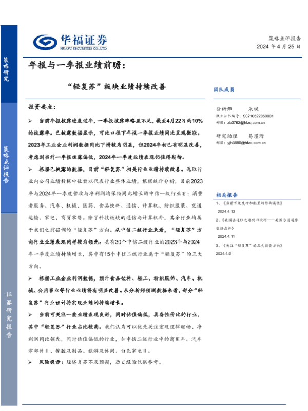 一季报 业绩前瞻 华福证券 年报 轻复苏