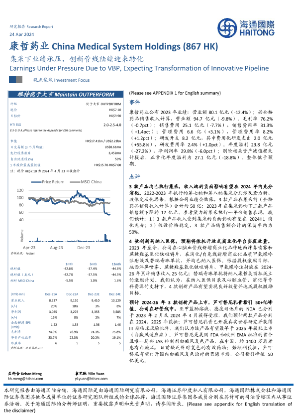 【海通国际】【20240424】康哲药业(00867.HK)集采下业绩承压,创新管线陆续迎来转化-13页