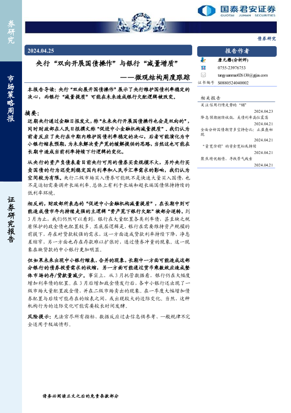 【国泰君安证券】【20240425】微观结构跟踪:央行“双向开展国债操作”与银行“减量增质”-13页
