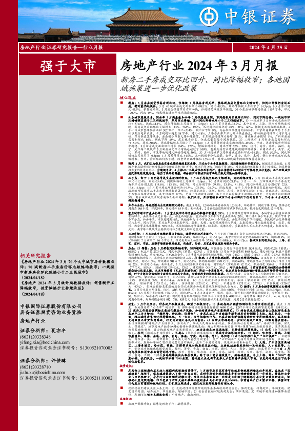 【中银证券】【20240425】房地产行业2024年3月月报:新房二手房成交环比回升、同比降幅收窄;各地因城施策进一步优化政策-27页
