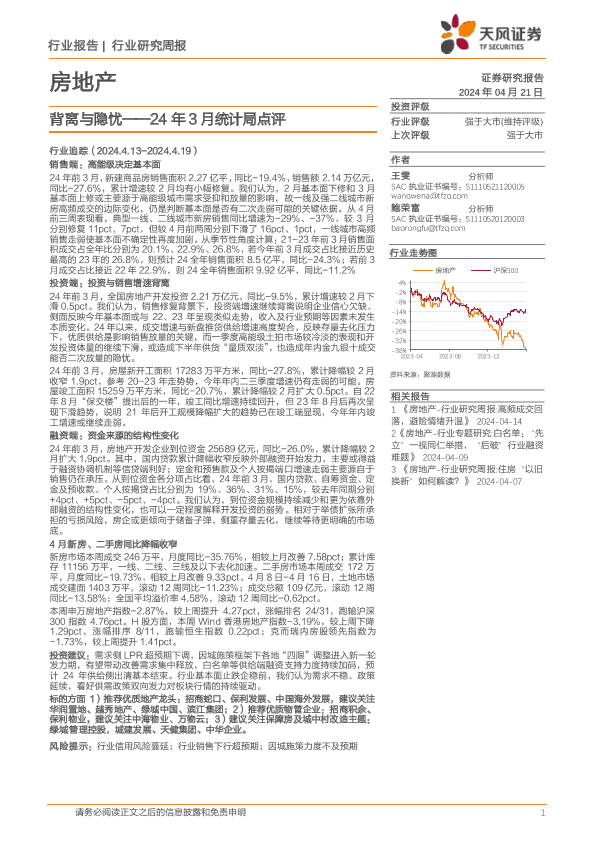 【天风证券】【20240421】房地产行业24年3月统计局点评:背离与隐忧-20页