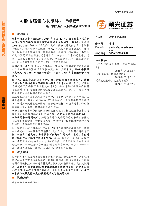 【甬兴证券】【20240424】新“国九条”及相关监管政策解读:A股市场重心长期转向“提质”-12页