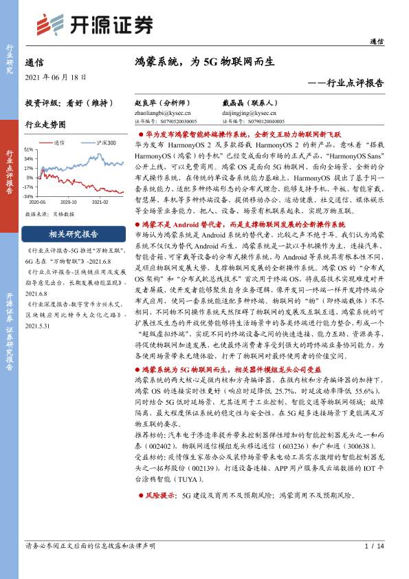 【开源证券】【20210618】通信行业点评报告:鸿蒙系统,为5G物联网而生-14页