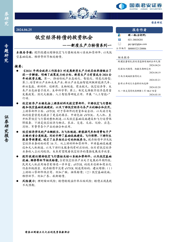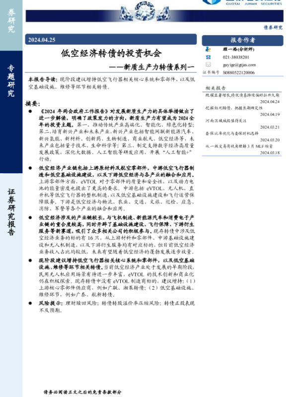 【国泰君安证券】【20240425】新质生产力转债系列一:低空经济转债的投资机会-10页