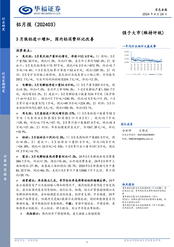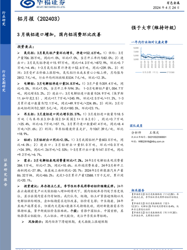 【华福证券】【20240424】有色金属行业铝月报(202403):3月俄铝进口增加,国内铝消费环比改善-13页