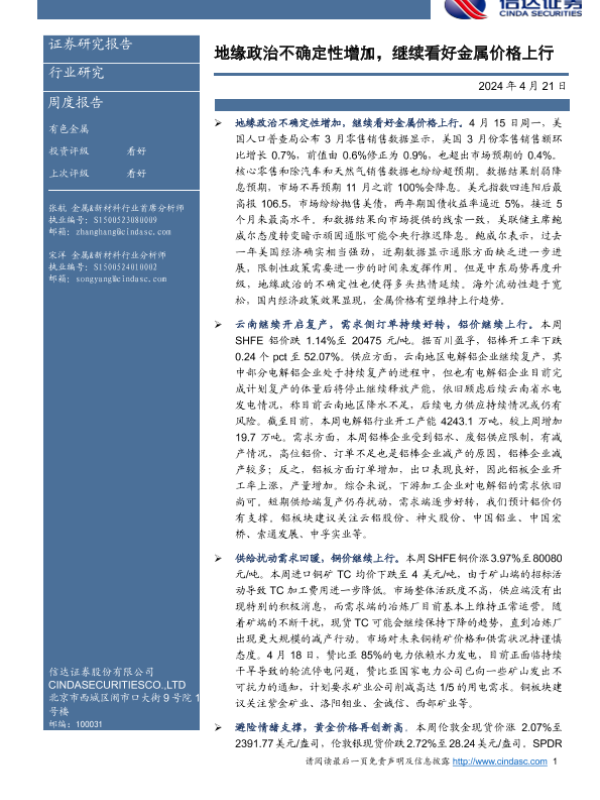 【信达证券】【20240421】地缘政治不确定性增加,继续看好金属价格上行-11页