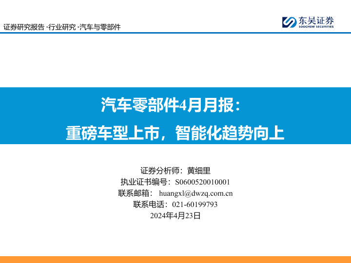 【东吴证券】【20240423】汽车零部件4月月报:重磅车型上市,智能化趋势向上-34页