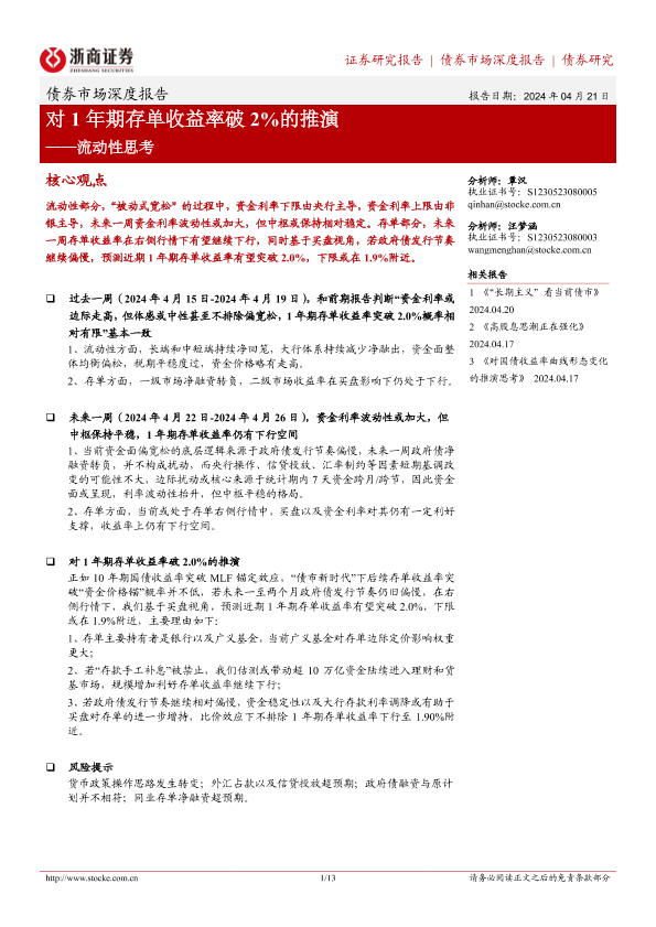 【浙商证券】【20240421】流动性思考:对1年期存单收益率破2%的推演-13页